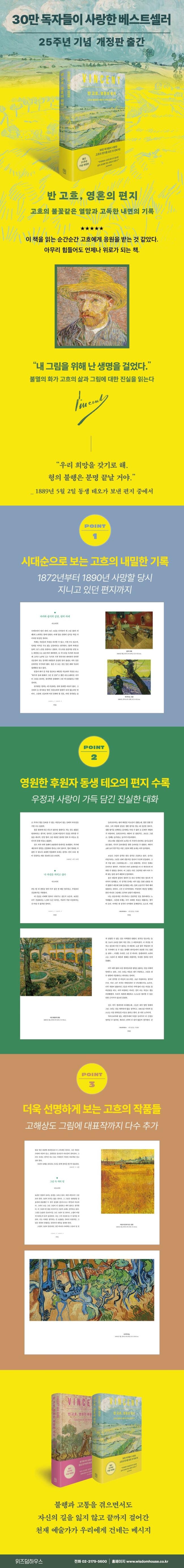 《반 고흐, 영혼의 편지》는 고흐의 편지를 본격적으로 국내 독자에게 소개한 최초의 책이다. 1999년부터 지금까지 30만 독자에게 꾸준히 사랑을 받았는데, 고흐가 실제 쓴 글을 읽을 수 있다는 것, 편지에서 설명한 작품과 그 시기에 그린 그림들을 함께 보고 감동할 수 있다는 점이 큰 매력이었다. 이번에 출간 25주년을 기념하는 개정판은 새로운 표지와 함께, 획기적으로 그림을 보완했다.