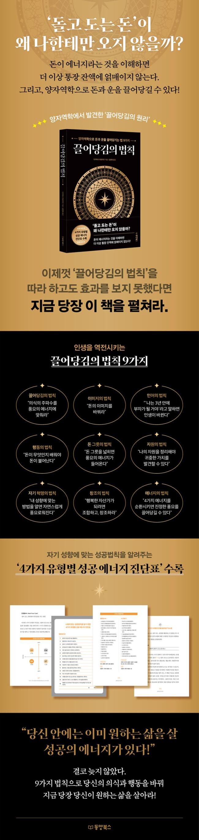 ‘끌어당김의 법칙’으로 돈을 얻고 원하는 삶을 살게 되었다는 후기가 넘쳐난다. 그런데 왜 같은 ‘끌어당김의 법칙’을 따라 한 나는 성공하지 못할까? 이런 답답함을 느낀 적이 있다면, 양자역학으로 끌어당김의 원리를 알려주고 구체적 실천법까지 제시하는 이 책이 반가울 것이다.