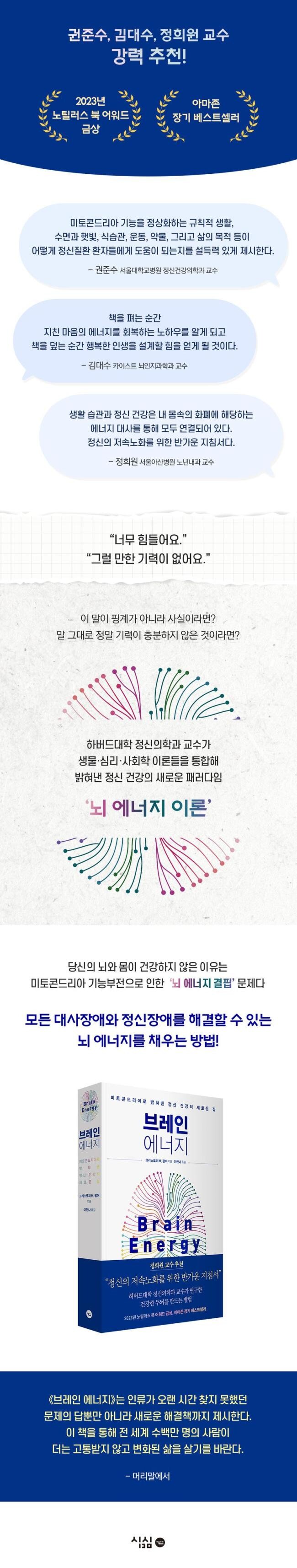 총 3부로 이루어진 이 책은 정신질환을 앓는 당사자나 정신 건강 전문가들이 왜 이 근본적인 원인을 놓치고 있는지, 그리고 정신질환이 어떻게 신체질환인 대사장애와 연결되는지 설명한다. 그다음으로 미토콘드리아가 어떤 핵심 역할을 하는지 파고든다. 저자는 자신의 ‘뇌 에너지 이론’을 통해 병을 치료하거나 증상을 완화시킨 사례 또한 책에 담았다. 《브레인 에너지》는 20년이 넘는 연구를 통해 밝혀낸 새롭고 놀라운 시각은 제공함과 동시에 기존의 정신질환 치료의 한계를 뛰어넘는 정신의학계의 새로운 지평은 여는 책이 될 것이다.