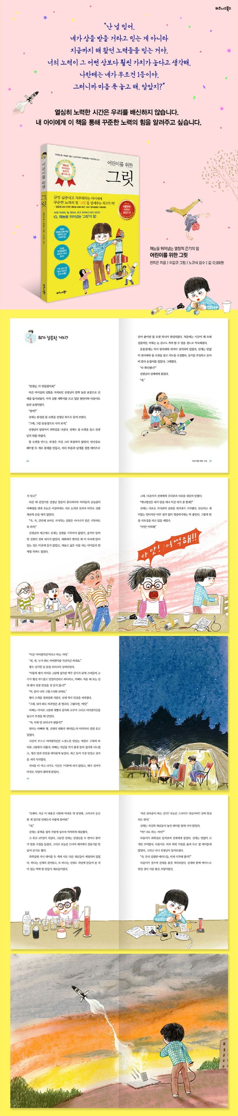 《어린이를 위한 그릿》은 이야기의 재미뿐 아니라 아이들이 동화를 읽고 그릿에 대해 한 번 더 생각하고 생활 속 작은 실천으로 이어갈 수 있도록 본문 속에 생각 키우기 코너를 두었다. 생각 키우기는 책의 내용을 감수한 노규식 박사가 그간 청소년 심리 · 학습 전문가이자 SBS ‘영재발굴단’의 자문위원으로 활동하면서 경험했던 바를 이 책에 맞게 풀어낸 것으로, 아이들이 책을 읽으면서 직접 적어볼 수 있도록 ‘책 속 워크북’ 형태로 구성되었다.