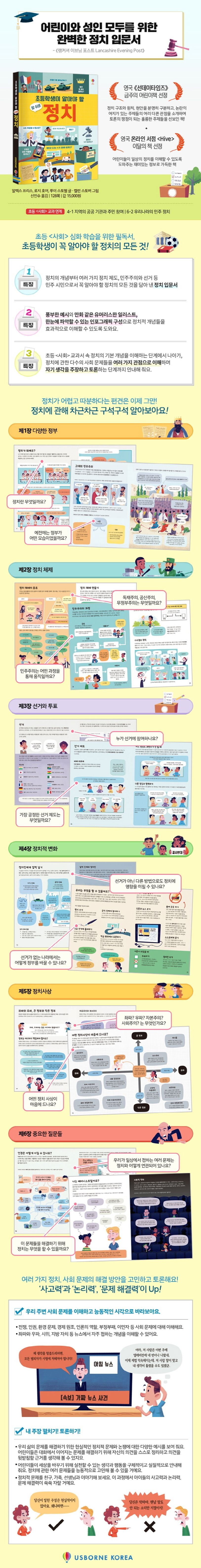 제1장에서는 ‘다양한 형태의 정부’에 대해 이야기한다. 고대 그리스에서 발생한 최초의 민주주의의 모습부터 공화정, 오늘날의 대의 민주주의까지 살펴보며 정부의 형태는 나라와 시대마다 조금씩 다르다는 점을 알게 된다. 제2장에서는 정부의 형태에 따라 달리지는 다양한 ‘정치 체제’를 살핀다. 독재주의, 공산주의, 민주주의, 삼권분립, 지방자치 등을 각 나라의 실제 사례를 들어 함께 다루고 있다. 이어 제3장에서는 민주주의가 정치체제인 나라에서 이루어지는 ‘선거와 투표’를 심도 있게 알아본다. 선거의 과정과 비례 대표제, 다수 대표제 등의 개념도 짚어간다. 이어 제4장에서는 ‘정치적 변화’가 필요한 상황에서 어린이들이 할 수 있는 일을 소개한다. 제5장에서는 정치인마다 다를 수 있는 ‘정치사상’에 대해 살펴보며 좌파와 우파, 큰 정부와 작은 정부, 자본주의와 사회주의 등의 개념을 풍부한 정치적 사례를 들어 살펴본다. 제6장에서는 전쟁, 인권, 환경 문제, 경제 원조, 언론의 역할, 부정부패, 이민자 등 정치와 연관된 사회 문제에 대해 알아보고, 서로 다른 관점을 소개하며 여러 중요한 질문에 대한 답을 탐구한다. 세계를 아우르는 풍부한 정치적 사례를 접하고 개념을 익혀 가는 과정은 어린이가 시야를 넓히고 민주 의식을 갖출 수 있게 도울 것이다.