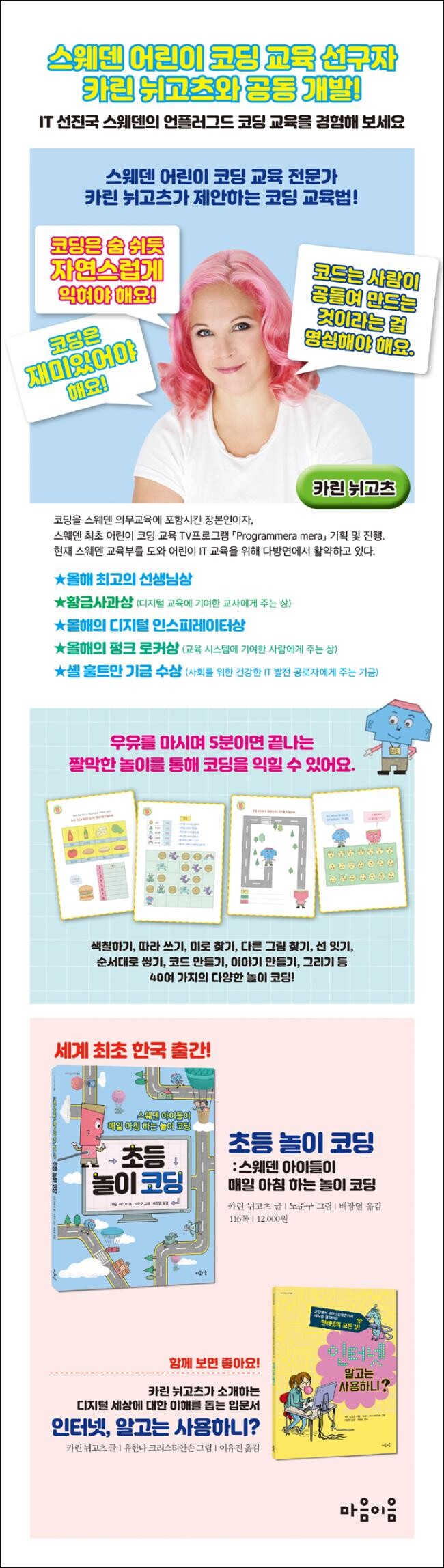 이 모든 놀이는 컴퓨터 없이 자연스럽게 놀이를 하면서 원리를 탐색할 수 있는 언플러그드 코딩 활동이다. 아이들은 색칠하기, 따라 쓰기, 미로 찾기, 다른 그림 찾기, 선 잇기, 순서대로 쌓기, 코드 만들기, 이야기 만들기, 그리기 등 40여 가지의 다양한 놀이를 통해 즐겁게 게임하듯 코딩과 친해질 수 있다.
