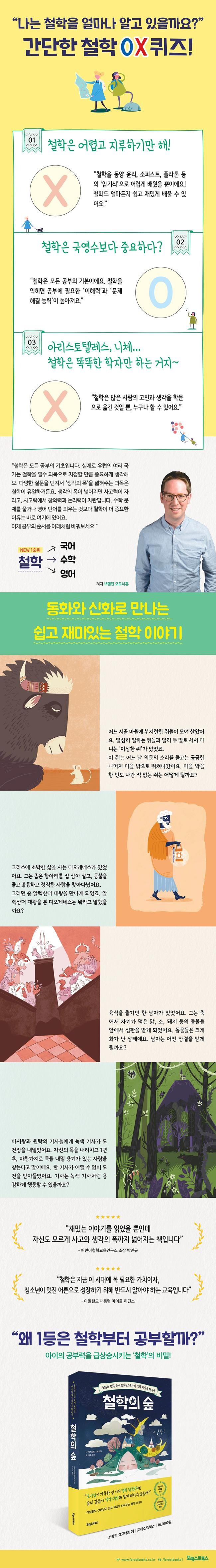실제 교육현장에서 이러한 아이들의 특성을 간파한 저자는 『철학의 숲』에 딱딱한 이론은 아예 배제했다. 따분한 건 싫어하는 아이들을 위해 짧고 흥미진진한 이야기만을 골랐다. 몸에서 뇌가 분리된 남자, 저승에서 자신이 먹은 동물로부터 심판을 받게 된 사람, 신을 저버리고 인간을 도운 프로메테우스, 갑자기 나타나 목 자르기를 제안하는 기사까지 아주 다양한 장르의 동화와 신화를 수록했다. 또한 내용을 뒷받침하기 위한 플라톤, 칸트 같은 철학자의 사상은 오로지 핵심만 간단하게 담았다. 더불어 환상적인 북유럽풍 일러스트까지 더해져 이 책은 철학에 대한 기존의 거부감을 모조리 없애줄 것이다.
