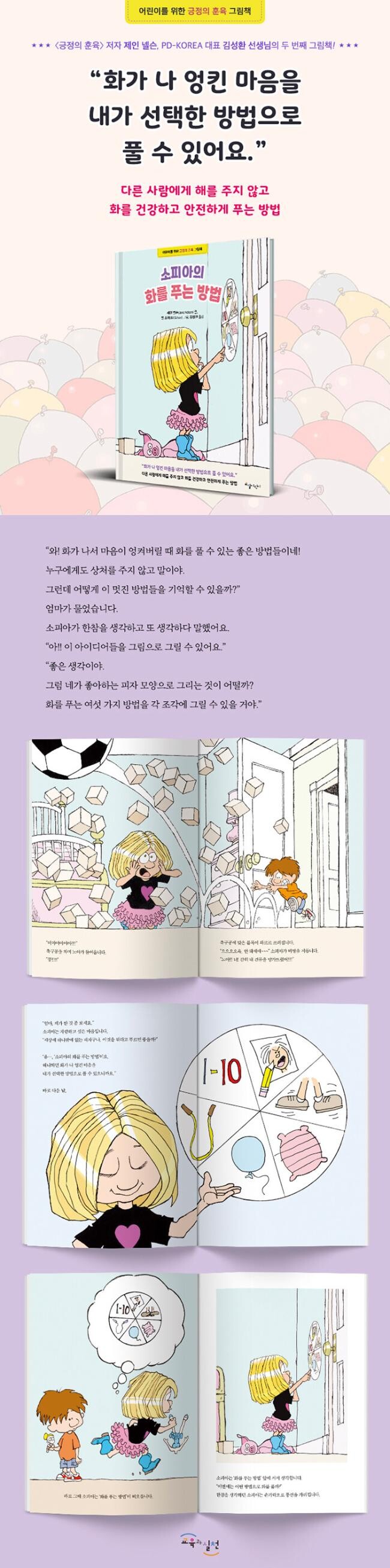 『소피아의 화를 푸는 방법』은 전 세계에서 사랑받는 ‘긍정의 훈육’ 시리즈 중에서 어린이를 위한 그림책으로 2018년에 출간한『제라드의 우주쉼터』에 이은 두 번째 책이다. ‘긍정의 훈육’ 창시자인 제인 넬슨은 이 책에서 화가 나 엉킨 마음을 다른 사람에게 상처 주거나 때리지 않고 건강하고 안전하게 해소하는 방법을 알려준다.
