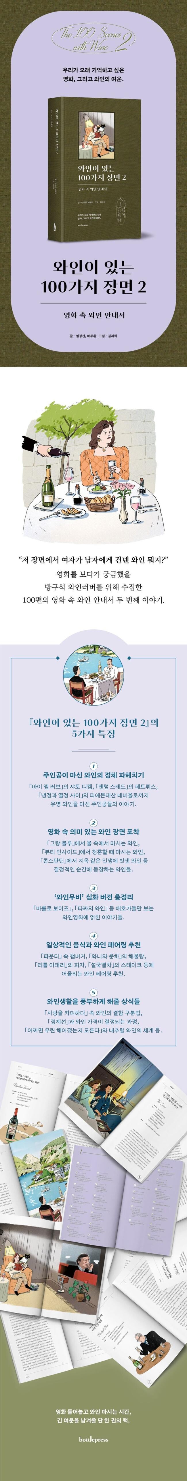 무엇보다 《와인이 있는 100가지 장면 2》의 매력은 와인이 등장하는 장면의 여운을 오래 누리고, 새로운 시도를 해보고 싶게 만드는 데 있다. 책에 수록되지 않았다면 스스로 고르지 않았을 영화의 줄거리를 따라가 보며, 그리고 그 영화 속 와인이 있는 장면의 분위기를 작가의 말에 근거해 상상하다 책을 덮고 나면, 마음속에 꼭 보고 싶은 영화, 꼭 마셔보고 싶은 와인을 잔뜩 담게 된다. 와인을 잘 모르는 독자에게는 친절한 길잡이가 되고, 와인을 즐기는 이에게는 감정의 깊이를 더해주는 이 책과 함께, 영화를 보며 놓치기 쉬운 와인의 언어를 해석해내는 지적 탐험을 시작해보자.
