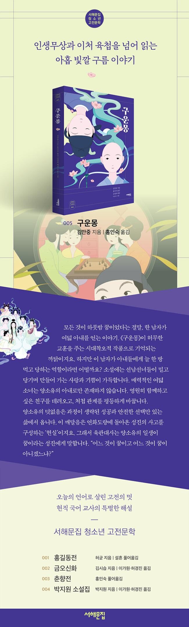 청소년 독자와 《구운몽》의 첫 만남은 보통 성진이 깨달음을 얻는 장면에서 이루어진다. 《구운몽》이 허무하고 따분한 교훈을 주는 작품으로 기억되고 마는 까닭이다. ‘모든 것이 하룻밤 꿈이었다’는 성진, ‘장주가 꿈에 나비가 되었으니…’ 하며 알쏭달쏭한 말을 하는 육관대사. 성진이 꾸었다는 꿈은 ‘외모와 능력을 다 가진 남자가 여덟 아내를 얻는 것’이니 시대착오적으로 보이기까지 한다.
