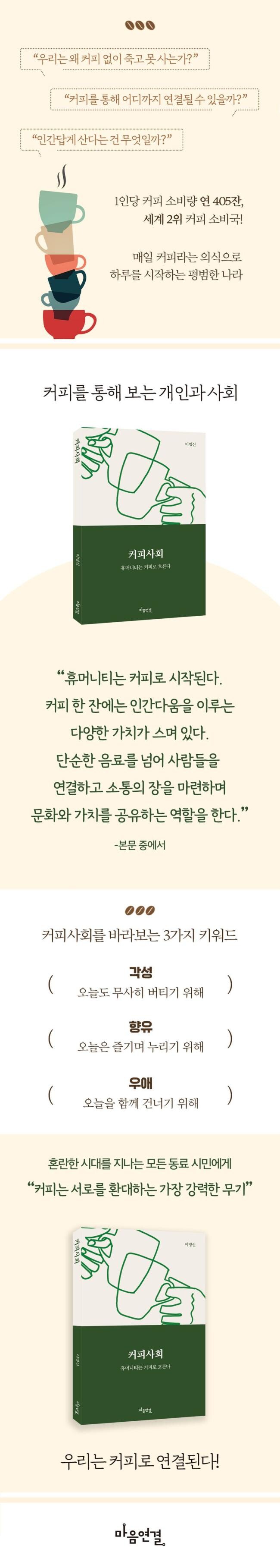 커피는 가장 개인적이면서 가장 사회적인 음료다. 《커피사회》는 매일 커피라는 의식으로 하루를 시작하는 평범한 사회에 관한 이야기다. 커피 한잔에는 각자의 서사와 욕망이 담겨 있다. 특히나 한국 사회에서 커피는 단순한 음료가 아닌 삶의 일부다. 이 책을 통해 우리 사회를 관통하는 커피라는 언어를 이해할 수 있다.