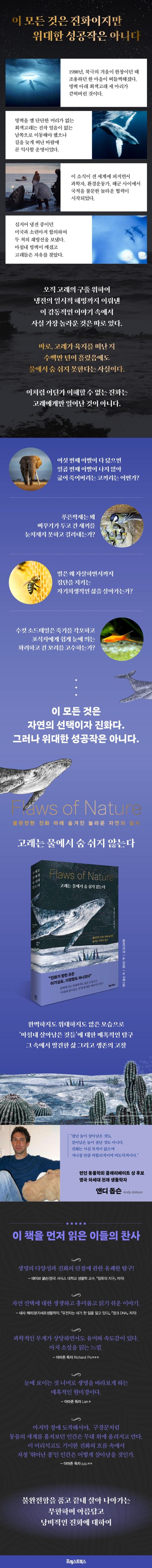 우리는 생물이 시간이 흐름에 따라 환경에 최적화된 모습으로 진화한다고 생각한다. 이론적으로 진화는 ‘부적합한 것을 제거하는 무한한 메커니즘’이지만, 이 과정에서 진화는 인류가 만든 환경의 변화로 함정에 빠지기도 하고, 목숨을 위협하는 약점을 만들어내고, 상호파괴적인 방식으로 아름다움을 추구하기도 한다. 『고래는 물에서 숨 쉬지 않는다(원제: Flaws of nature)』는 원제처럼 이처럼 불완전한 진화를 이끈 자연의 결점을 이야기하는 책이다. 학술 문헌에 1000번 이상 인용될 만큼 인상적이고 탁월한 연구를 발표해온 영국의 차세대 생물학자 앤디 돕슨은 생물의 완벽한 적응을 가로막는 다양한 유형의 갈등을 다루며 이 세계의 질서를 속속들이 파헤친다. 책에는 대표적으로 다섯 가지의 갈등이 풍부한 사례와 과학적 증거를 바탕으로 유려하게 펼쳐진다.