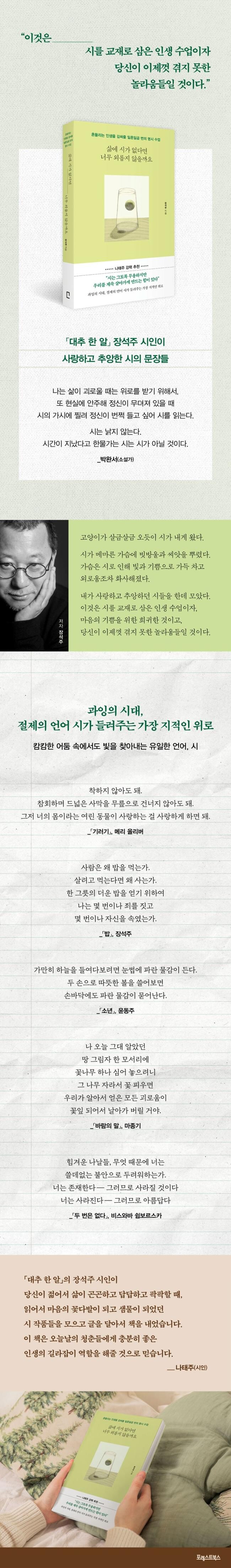 그런 세상에서 이 책 『삶에 시가 없다면 너무 외롭지 않을까요』의 저자는 ‘시’가 가진 힘을 믿는다. “삶이 외롭고 허무하게 느껴질 때마다 우리는 적극적으로 시 속으로 들어가야 합니다.” 힘들 때 마주하는 시 한 편은 누군가의 ‘괜찮다’라는 말보다 더 깊고 진한 위로를, 한 줄 한 줄 읽을 때마다 바쁜 일상에 매몰돼 있던 생각과 감정의 확장을, 모든 것이 넘쳐나는 과잉의 시대에서 가장 짧은 문학이라는 성격 그 자체로 보여주는 덜어냄의 미학을 선사한다. 이 모든 것은 오직 시를 통해서만 가능하다. 그리고 책 속에는 잘랄루딘 루미, 윌리엄 버틀러 예이츠, 나태주, 김수영 등의 작품과 저자의 글이 더해져 있는데, 특히 저자의 글은 함축과 은유로 직조된 시를 이해하고, 시와 더 가까워지는 법을 섬세하게 그려낸다.