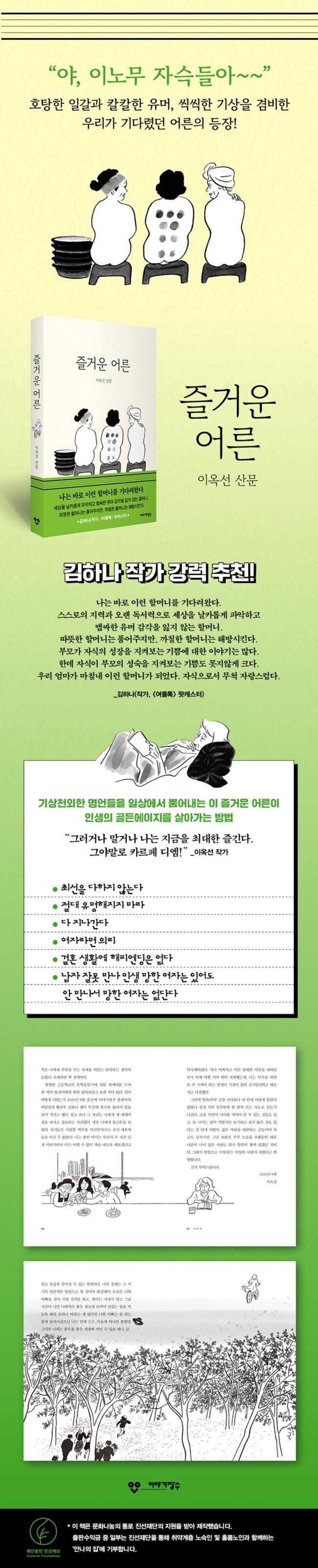 노년기는 누구에게나 찾아온다. 우리는 어떤 어른이 되어 노년을 맞이할 것인가. 돈 많은 어른? 존경받는 어른? 거창한 유산과 말을 남기는 어른? “나이는 얼굴의 주름이 아니라 자세에서 드러난다”며 자세를 꼿꼿이 하는 것을 게을리하지 않고, “두고 보아야 할 사안이나 인물들”을 오래오래 구경하고 싶어서 건강관리에 힘을 쏟겠다는 이옥선의 이야기는 우리도 다만 ‘즐거운 어른’이고 싶다는 꿈을 꾸게 한다.