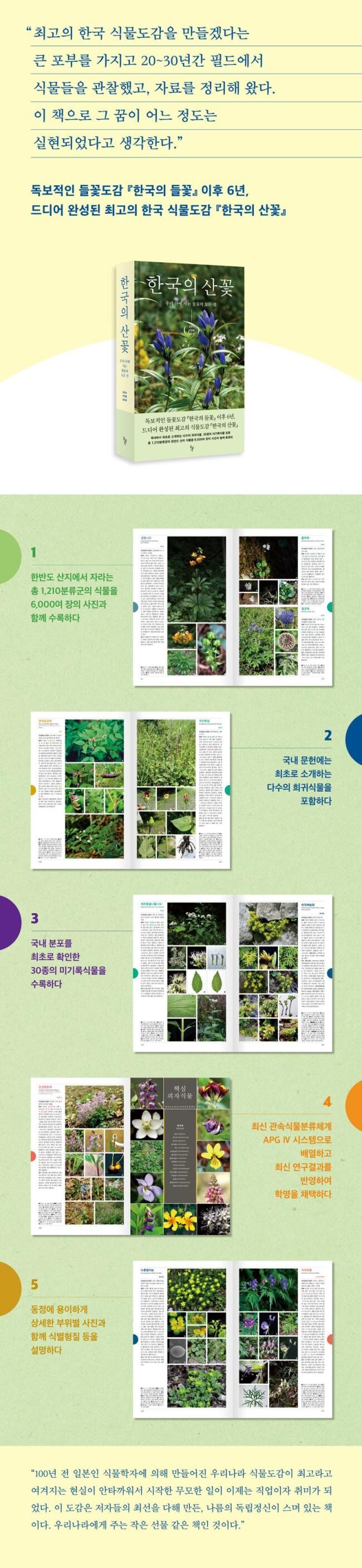 100년 전 일본인 식물학자에 의해 만들어진 식물도감이 한국 최고의 도감으로 여겨지던 시기는, 『한국의 산꽃』이 출간됨으로써 이제 완전히 막을 내리게 되었다. 한국인 스스로에 의한 최고의 한국 식물도감을 만들겠다는 큰 포부로 30년간 한반도 전역과 주변 지역을 누비며 ‘어려워서 하기 싫고 귀찮은 일들을 건너뛰지 않고, 반복되는 작업에도 꾀를 부리거나 게을리하지 않았던’ 우리 연구자들의 성실하고 꾸준한 노력은 비로소 이 책을 통해 집대성되었다. 그 바탕에는 “자연의 역사가 고스란히 담긴 고귀하고 소중한 식물들이 우리 땅에서 소멸하지 않고 우리 후배와 후손들과도 공유될 수 있길 소망”하는 저자들의 꽃과 식물, 한반도와 지구의 생명에 대한 귀한 사랑이 담겨 있다. 그렇기에 풍성하고 꼼꼼하게, 새로운 식물들의 식생을 발견하는 기쁨과 함께, 때로는 희귀식물들이 자생지에서 소멸해 가는 모습을 안타까운 마음으로 기록하며 이 거대한 작업에 임할 수 있었던 것이다.