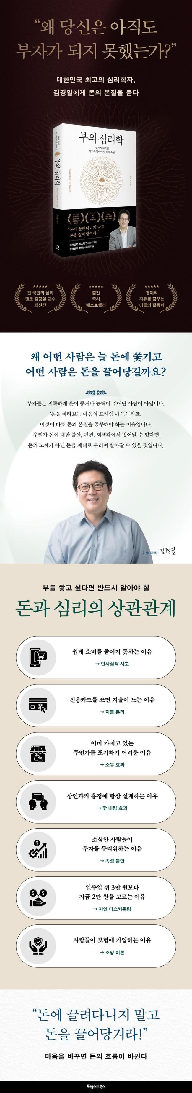 대한민국 최고의 인지심리학자로 불리는 김경일 교수. 그는 박사학위 논문 주제가 ‘돈’이었을 정도로 돈을 대하는 인간의 모순된 태도와 행동에 관심을 갖고 오랜 시간 연구해 왔다. 그리고 사람들이 돈을 벌고 싶다고 말하면서도 정작 인간이 돈을 어떻게 인식하는지에 대해서는 고민하지 않는다고 지적하면서 왜 우리가 소중하게 번 돈을 흥청망청 써버리고 후회하는지, 왜 합리적이지 못한 선택으로 인해 돈과 멀어지는지를 인지심리학적 관점에서 흥미롭게 풀어내 이 책 『부의 심리학』에 담아냈다.