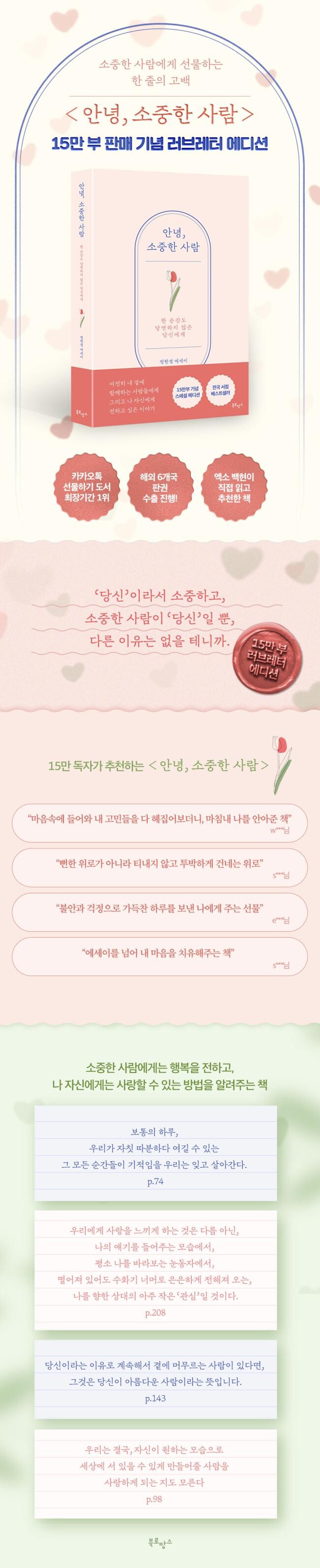 상냥하고 따뜻한 말들로 우리의 마음을 어루만져 주는 그의 글은 삶의 위로가 된다. 우리가 얼마나 가치 있는 사람인지, 얼마나 용기 있는 사람인지 알려 주는 글귀들을 늘 가슴 한켠에 간직해 뒀다가 꺼내 보고 싶다. 당신의 아픔은 당연하지 않다고, 당신의 슬픔에 조건은 필요없다고 손을 내미는 그의 문장들은 어쩌면 지친 우리에게 그 어떤 응원보다 가장 필요한 말들이 아니었을까