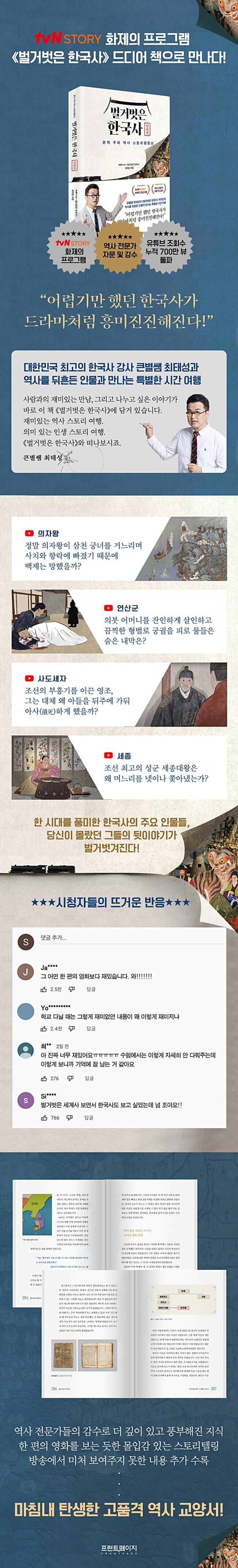 한국인이라면 누구나 한 번쯤 우리 역사에 대해 배웠을 테지만 어쩐지 역사 앞에서는 목소리가 작아지고 연도, 사건, 인물 같은 단편적인 지식만 떠오르기 일쑤다. 역사를 재미있는 이야기가 아니라 외울 것 많고 복잡한 지식으로 접했기 때문이다. 흩어져 있는 정보들을 하나로 모으고 역사적 사실을 오랫동안 기억하기 위해서는 역사는 ‘이야기’라는 본질에 주목해야 한다. 우리 역사의 주요 장면들을 벌거벗겨 흥미로운 이야기로 들려주는 tvN STORY 〈벌거벗은 한국사〉도 바로 그 지점에서 출발했다.