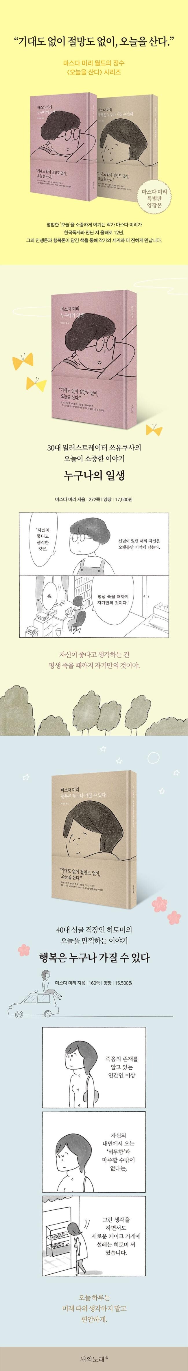 그 소중한 세계와 만난다. 마스다 미리의 인생론과 행복론이 담긴 2권의 책을 시리즈로 묶었다. 30대 일러스트레이터 쓰유쿠사의 이야기가 담긴 『누구나의 일생』과 40대 싱글 직장인 히토미의 연애 이야기가 담긴 『행복은 누구나 가질 수 있다』이다. 각각 독립적인 작품이지만, 작가의 세계와 더 진하게 만날 수 있도록 특별판으로 준비했다.