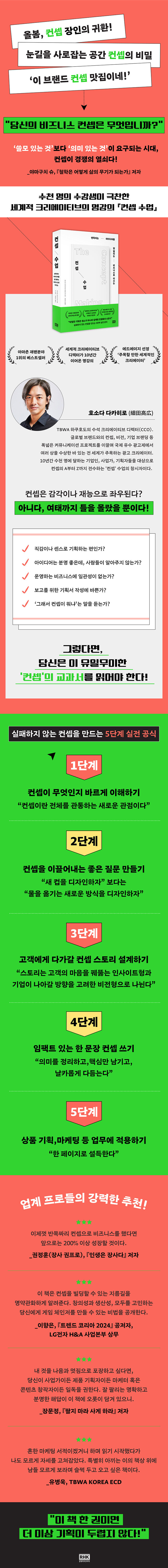 출간 즉시 중판! 아마존 재팬 마케팅&세일즈 분야,비즈니스 매니지먼트 분야 1위의 베스트셀러!수천 명이 극찬한, 세계적 크리에이티브 디렉터호소다 다카히로의 ‘컨셉 수업’을 책으로 만나다“탁월한 기획은 센스가 아니라 설계된 컨셉에서 나온다!”누구든 실패하지 않는 컨셉을 만드는 방법“그래서 컨셉이 뭔데?” 가슴에 비수처럼 꽂히는 이 말에 좀처럼 대꾸할 수 없다면, 아마도 직감과 센스에 의존해 기획했을 확률이 높다. 그것만으로는 높은 완성도를 담보하기 어렵고, 어쩌다 운 좋게 좋은 성과를 거두었다 해도 언젠가 드러날 허점에 본인도 초조해진다. 한편, 탁월한 기획자는 높고 균일한 완성도를 유지할 뿐 아니라 업무 자신감도 높다. 그렇다면 비결이 무엇일까? ‘컨셉 전문가’인 저자 호소다 다카히로는 그 비결이 ‘틀’에 있다고 말한다.이 책에서 저자는 컨셉을 만드는 데 용이한 ‘틀’을 제시한다. 컨셉을 이끌어내는 질문을 만들기 위해 질문을 다각도로 재구성하는 10가지 방법, 컨셉을 스토리로 구성하기 위해 인사이트형과 비전형으로 나누어 사용할 수 있는 시트, 완성된 스토리를 임팩트 있는 한 문장으로 압축하기 위한 8가지 표현법 등 바로 적용해 결과물을 도출할 수 있도록 도와준다. 각 장에 수록된 예제 문제와 예시 답안은 독자가 각 단계를 제대로 이해했는지, ‘틀’을 제대로 활용할 수 있는지를 스스로 점검하게끔 한다. 부록에는 강의에서, 현장에서 저자가 많이 듣는 질문들을 정리해 답한 Q&A를 구성했는데 이 또한 일종의 ‘틀’이다. 이러한 사려 깊은 구성은 독자로 하여금 이 책의 내용을 신뢰할 수밖에 없게 만든다.쉽고 친절하게 쓰인 『컨셉 수업』을 읽으면, ‘컨셉’에 익숙한 이들은 기존보다 200% 효과적인 컨셉을 도출할 수 있게 될 것이며, 처음 접한 이들에게는 자신도 좋은 컨셉을 도출할 수 있다는 데서 과정의 재미를 느끼게 될 것이다.