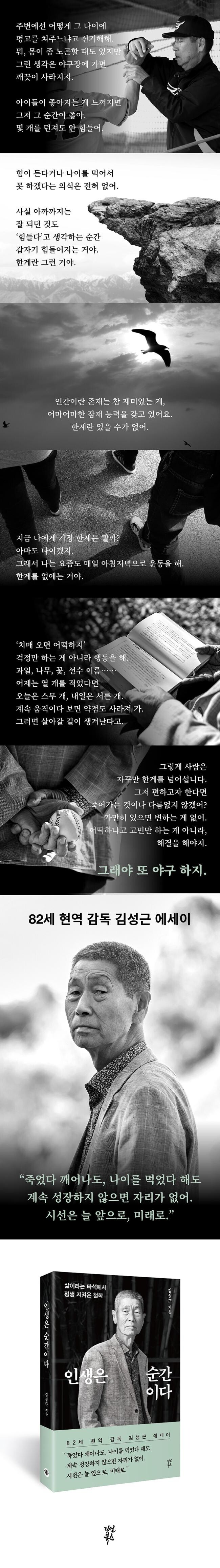 결국 김성근이 이 책을 통해 말하고 싶은 것은 무수히 실패하고 시행착오를 겪을지라도 도전하는 순간들이 쌓이고 쌓이면 마침내 새로운 길이 열린다는 인생의 진리다. 그의 인생이, 그가 가르친 제자들이 그것을 증명했다. 단 한 번이 아니라 매 순간을 그토록 절박하게 살아야 한다는 것, 그래서 ‘인생은 순간이다.’ 물론 인생에서 마주치는 모든 순간을 놓쳐서는 안 되며 아프다거나 한계라거나 하는 의식 없이 쏟아부어야 한다는 김성근의 인생 철학은 소위 말하는 ‘꼰대’의 이야기로 들릴 수도 있다. 그럼에도 김성근이 〈최강야구〉에서 하는 말마다 화제가 되고, 폭발적인 인기를 얻는 비결은, 그가 80대의 나이에도 여전히 자신의 철학을 몸소 실천하고 있기 때문이며 ‘영원히 늙지 않는’ 그라운드 위의 승부사로서 그 철학이 옳음을 증명해 왔기 때문일 것이다.