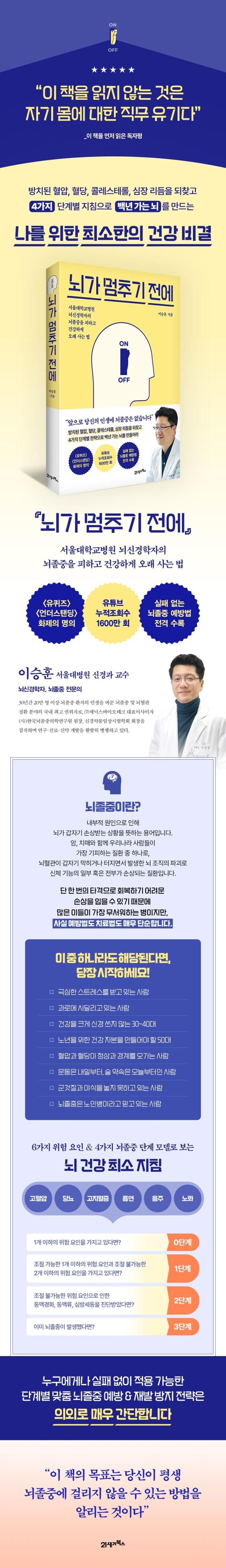 저자의 메시지는 간명하다. ‘뇌는 한 번 멈추면 되돌릴 수 없다. 그러나 그 멈춤을 막는 일은 생각보다 간단하다.’ 뇌졸중을 예방하고 삶의 방식과 행동을 바꾸는 실천 전략을 제시하는 이 책은 단 한 명의 인생이라도 지키기 위해 저자의 30년 노하우를 담아낸 ‘뇌 건강 안내서’이자 평생을 곁에 두고 참고해야 할 ‘생활 지침서’다. 이 책이 더는 병이 ‘나를 선택하게 두지 않겠다’라는 결심의 시작점이 되어줄 것이다.