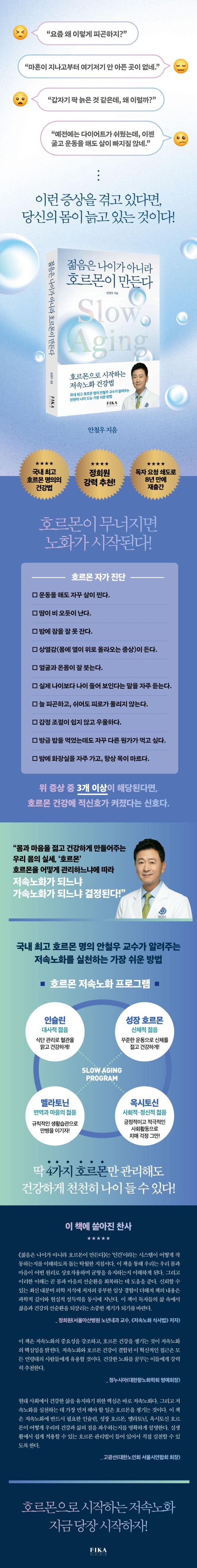 국내 최고 호르몬 명의 안철우 교수의 호르몬 저속노화 건강법은 아주 간단하다. 단 네 가지 호르몬만 관리하면 되는 ‘호르몬 저속노화 프로그램’을 따르면 된다. 이 프로그램은 자신의 생활패턴에 맞게 스스로 프로그램을 짜서 실천할 수 있다는 게 특히 장점이다.