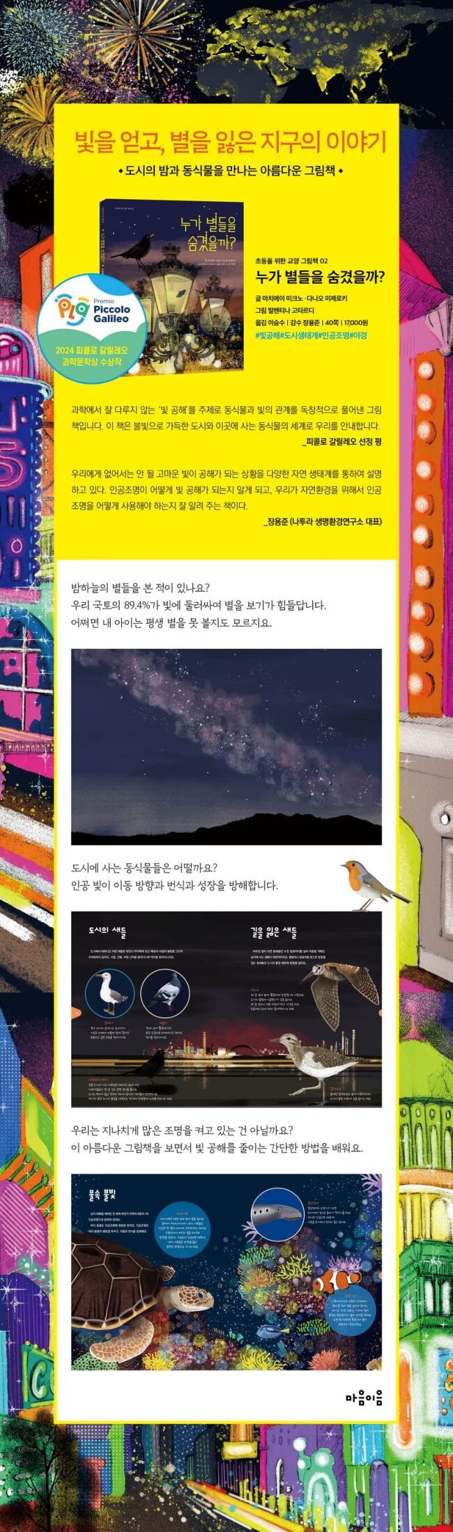 피콜로 갈릴레오 과학문학상을 수상한 『누가 별들을 숨겼을까?』도 기존에 보았던 과학 그림책과는 결이 다르다. 밤 풍경이 시원하게 펼쳐지는 양면 그림, 그림들에 자연스레 녹아든 정보들, 고즈넉한 도시의 야경이 쉼표처럼 양쪽 펼침 면으로 크게 나타나는 그림은 독자의 마음까지도 고요하게 만든다.