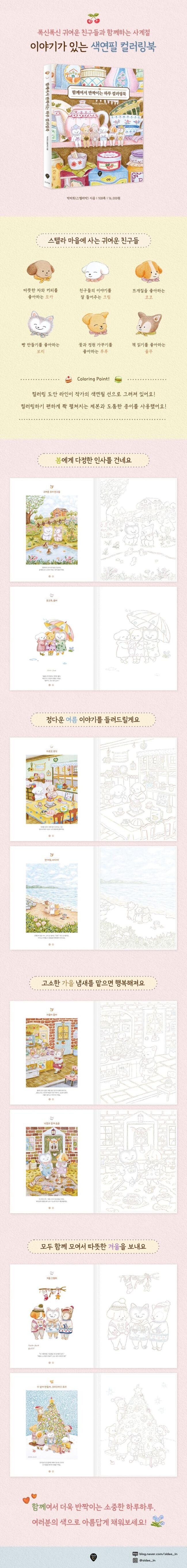 귀여운 여섯 친구가 사는 스텔라 마을. 함께 하기에 더욱 행복한 하루하루를 보내는 강아지 친구들을 만나보세요. 봄에는 향긋한 차를 함께 나눠 마시고, 여름에는 바닷가 마을에 사는 친구를 만나러 놀러 가고, 가을에는 달콤하고 따뜻한 빵을 구워서 나눠 먹고, 겨울에는 다 같이 예쁜 크리스마스트리를 꾸며요. 보고만 있어도 마음이 포근해지는 40점의 그림을 수록하였으니, 여유를 가지고 천천히 완성해 보세요.