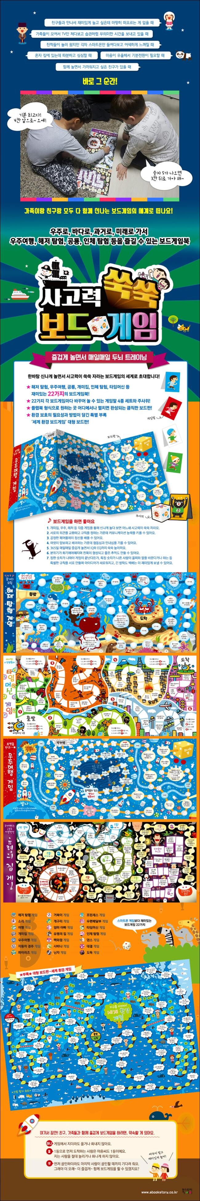 친구들과 만나서 재미있는 놀이를 하고 싶은데 마땅히 떠오르는 게 없을 때, 가족들이 모여서 TV만 쳐다보고 습관처럼 무의미한 시간을 보내고 있을 때, 친척들이 놀러 왔지만 각자 스마트폰만 들여다보고 따로 있는 것처럼 어색하게 느껴질 때, 바로 그때 재미있는 보드게임의 세계로 떠나보자! 가족, 친구, 친척들과 다 함께 우주로, 바다로, 과거로, 미래로 가서 우주여행, 해저 탐험, 공룡, 인체 탐험 등을 즐길 수 있는 보드게임북 『사고력 쑥쑥 보드게임』이 북스토리아이에서 출간되었다. 해적으로, 공룡으로, 우편배달부로, 개미로 변신하여 신나게 놀다 보면 어느새 사고력이 쑥쑥 자라는 보드게임이 무려 22가지나 들어 있다.