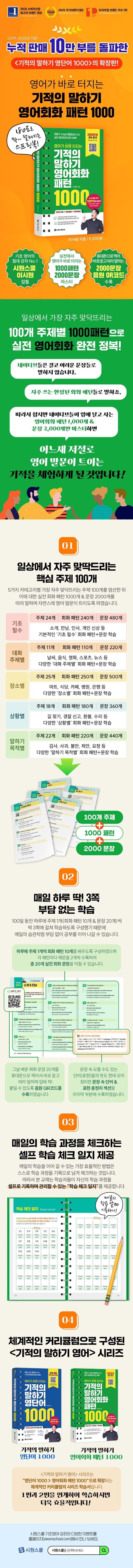 2019년도에 출간된 후 2025년까지 누적 판매 부수 10만 부를 돌파한 <기적의 말하기 영단어 1000>의 확장판! 영단어에 이어 ‘실전 영어회화 문장’까지 구사할 수 있도록 기초영어의 절대 강자 ‘시원스쿨 이시원 강사’가 네이티브들이 입에 달고 사는 ‘필수 영어회화 패턴 1000개’를 마스터하도록 설계한 학습서입니다.