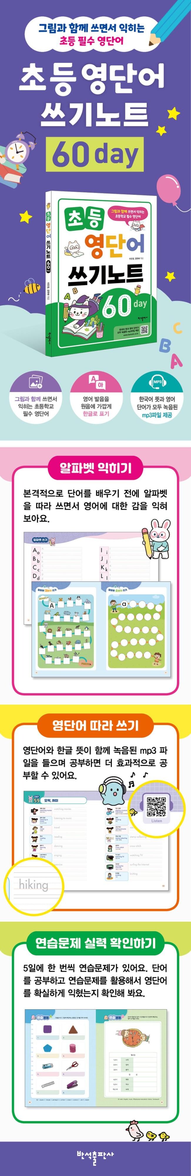 그림과 함께 영단어를 따라 쓰면서 초등학교 필수 단어를 익힐 수 있어요. 60일 구성으로 두 달 만에 한 권을 마칠 수 있어요. 영어 발음이 한글로 적혀있어서 발음을 연습할 수 있고, 한국어 뜻과 영어 단어가 함께 녹음된 mp3 파일을 들으면서 복습하고 정확한 발음을 익힐 수 있어요.