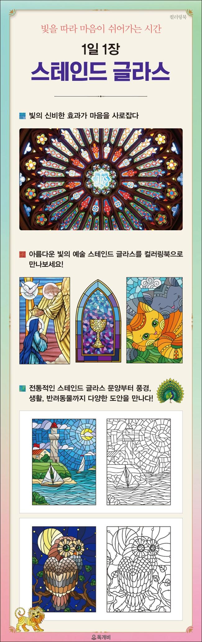 컬러링북은 색칠을 통해 일상적으로 겪는 스트레스를 잠시 잊고 평온한 상태가 되게 합니다. 컬러링북은 ‘컬러테라피’ 치료방법에서 시작되었습니다. ‘색깔(Color)’과 ‘테라피(Therapy)’의 합성어인 컬러테라피는 색의 에너지를 심리 치료에 활용해 스트레스를 완화하는 효과를 얻을 수 있어 많은 사람들이 도움을 받았습니다. 마음의 안정을 가져다주고 예술적 표현력을 높여주는 등 이미 잘 알려진 효과 외에도 말단 근육의 발달을 돕고 집중력을 높여 치매를 예방하는 등 실질적인 이점도 제공해줍니다. 스테인드 글라스 컬러링은 다양한 문양의 스테인드 컬러링을 직접 색칠하며 만나는 책입니다. 스테인드 글라스가 유리에 입힌 색이 빛을 만나 다양한 변화를 일으키듯 스테인드 글라스 컬러링북도 나만의 컬러링으로 힐링하는 시간을 갖기에 적합한 도안입니다. 종교적인 의미를 찾는 사람도 빛의 예술을 찾는 사람도 모두 매료될 수 있습니다.