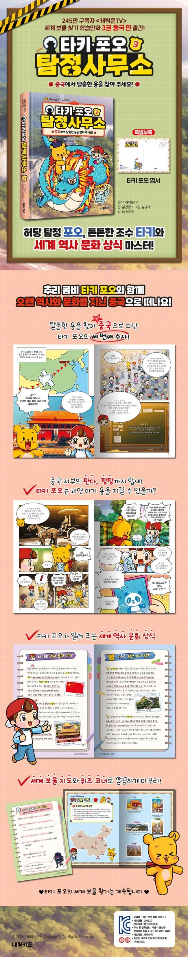 어느 날 ‘세계 보물 찾고 지키기’ 협회의 부회장 ‘미스터 마우스’로부터 세계 보물을 훔치고 다니는 ‘괴도 물음표’를 잡아 달란 사건을 의뢰받아 타키 포오의 세계 모험이 시작됩니다. 이번엔 괴도 물음표가 아니라 중국에서 탈출한 용을 찾아 달라는 미스터 마우스의 새로운 의뢰를 받고 타키 포오는 중국의 수도 베이징으로 떠나지요. 추리 콤비 타키 포오의 빛나는 수사에도 약점은 있기 마련! 매번 타키 포오를 놀리며 도망가기 바빴던 괴도 물음표가 중국 편에서는 큰 도움을 준다고 하는데요. 허당 곰돌이 탐정 포오, 든든한 조수 타키, 중국 편만의 특별 조력자 괴도 물음표와 함께 단서를 추리하며 탈출한 용을 찾아 중국을 모험하고 세계 역사 문화 상식을 재미있게 배워 보세요. 《타키 포오 탐정 사무소》 3권 중국 편에만 들어 있는 특별 부록 ‘타키 포오 캐릭터 엽서’도 놓치지 마세요!