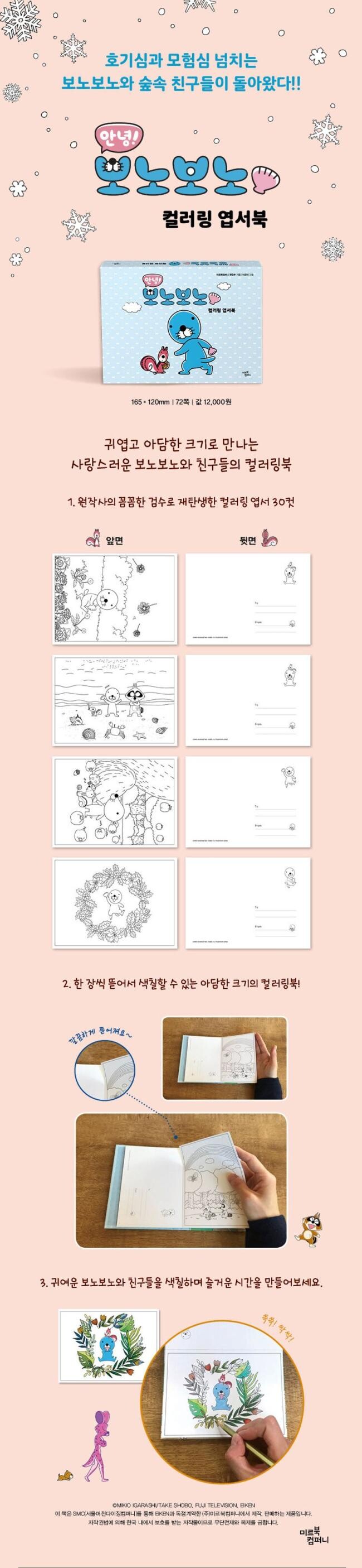 ‘보노보노’는 만화책과 TV 애니메이션으로 많은 사랑을 받아왔다. 이번에 미르북컴퍼니에서는 단순한 그림체와 재치 있는 내용이 돋보이는 보노보노 애니메이션을 주제로, 기존 컬러링북을 새로 기획하여 컬러링 엽서북을 디자인했다. 궁금한 것이 많아 끊임없이 질문하는 보노보노, 습관적으로 “때릴 거야?”라고 말하는 포로리, 숲속 제일가는 심술꾼 너부리, 모르는 것이 없는 척척박사 야옹이 형까지. 애니메이션에 등장하는 캐릭터들과 사계절감이 살아 있는 배경을 조화롭게 배치해 애니메이션의 느낌을 해치지 않도록 원작사의 꼼꼼한 검수를 통해 색다르게 컬러링북으로 재현해냈다. 30컷의 컬러링 엽서와 함께 채색 컬러링 4컷이 수록된 《안녕! 보노보노 컬러링 엽서북》을 통해 귀엽고 사랑스러운 애니메이션 보노보노의 감동과 재미를 새롭게 느낄 수 있을 것이다.