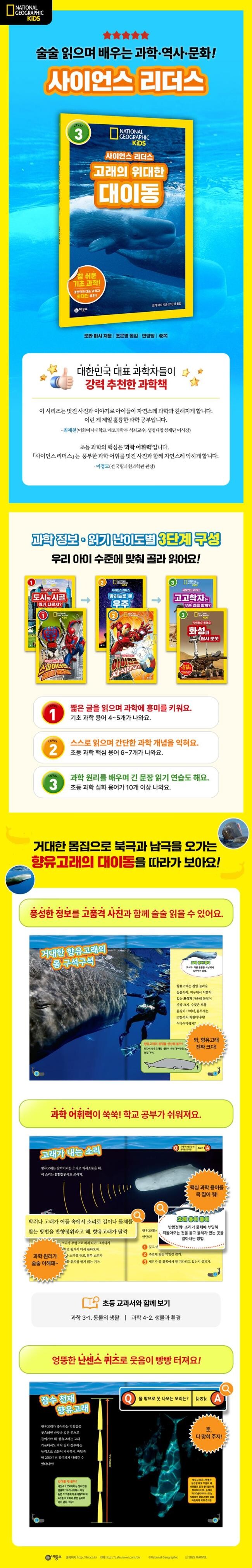 향유고래는 지구에서 이빨이 있는 동물 가운데 가장 큰 몸집을 자랑한다. 이 책은 거대한 향유고래가 어떻게 해마다 바다를 수천 킬로미터씩 이동하는지, 그 여정 속에서 어떤 생존 전략을 펼치는지를 생생하게 담아냈다. 이뿐 아니라 향유고래가 분기공으로 숨 쉬는 법, 소리로 길을 찾는 원리, 이주에 유리한 무리 생활 방식 등 향유고래의 생태 특징도 자세히 알려 준다. 이는 초등 과학 교과 속 ‘동물의 생활’, ‘생물의 환경’ 단원과 연계되어서 핵심 과학 개념과 용어를 자연스럽게 익힐 수 있다. 그린란드와 남극 대륙 사이의 드넓은 바다를 배경으로 펼쳐지는 향유고래의 대이동은 생명의 경이로움과 자연의 위대함을 다시금 일깨운다. 내셔널지오그래픽의 감탄을 자아내는 사진과 함께 책 읽기의 즐거움에 푹 빠져 보자.