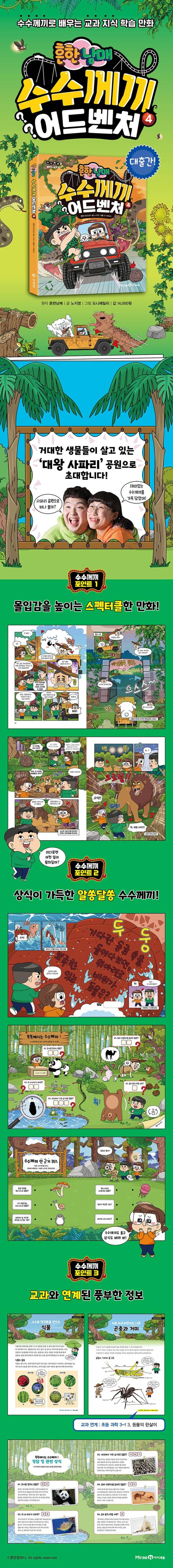 각 화 뒷장에는 교과 키워드를 담은 수수께끼 교과 지식과 똑똑해지는 수수께끼 페이지를 수록했습니다. 초등 과학 3학년 1학기 3. 동물의 한살이, 3학년 2학기 2. 동물의 생활, 4학년 2학기 1. 식물의 생활에 수록된 ‘포유류의 특징’, ‘파충류의 특징’, ‘식물의 분류’ 등 초등 교과와 연계된 핵심 정보를 한눈에 파악할 수 있습니다.