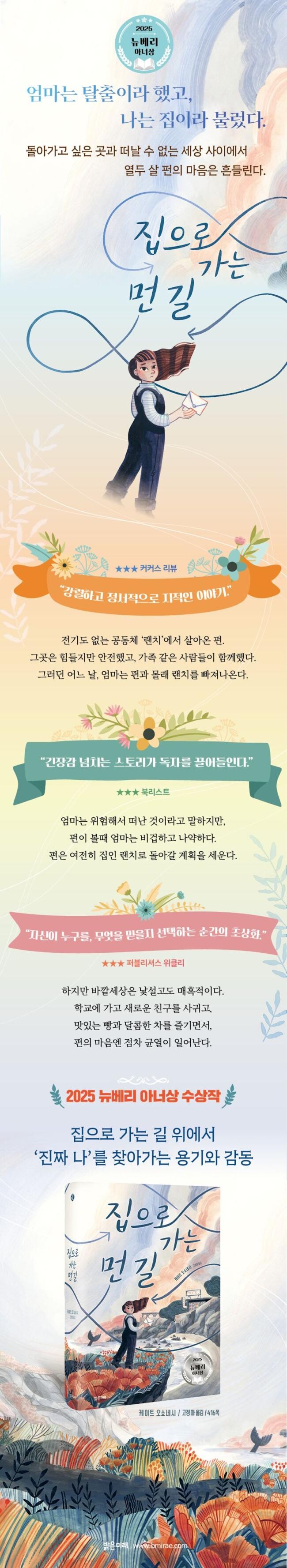 2025년 뉴베리 아너상은 『집으로 가는 먼 길』이 차지했다. 이 주니어 소설은 미국 내 역사와 전통을 자랑하는 유명 도서 평론지, 커커스 리뷰와 북리스트에 올해의 책에 선정되기도 하였다. 이 주니어 소설은 사이비 같은 한 공동체를 소재로 다루고 있다. ‘랜치’라고 불리는 자급자족 공동체는 과학 기술의 위험성을 얘기하면서 환경 보호를 중요시하고, 유해 물질 없는 농사를 지어 자급자족하려 한다. 그들이 내세우는 개념은 기후 위기 속에 있는 우리가 본받아야만 할 것 같다. 하지만 이 ‘랜치’란 곳은 이야기를 들으면 들을수록 의문이 든다. 그 정점이 바로 사람들을 가스라이팅하고 있는 벤 박사라는 존재다. 좋은 이야기를 하고 있는 듯하지만 사람들을 자신의 규칙에 맞게 재단하고 갈라치기를 한다. 그럼에도 불구하고 이 속에서 어릴 때부터 계속 생활해 온 주인공 펀은 ‘랜치’가 가장 안전하고 완벽한 집이라고 생각한다. 그래서 그곳으로 계속 돌아가고 싶다.