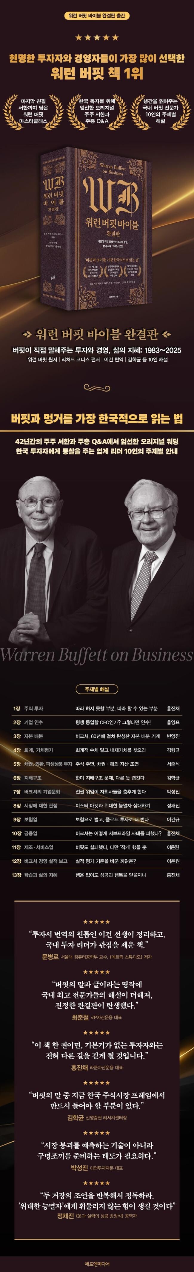 이번 책 《워런 버핏 바이블 완결판》에는 구판 《워런 버핏 바이블》의 핵심이 선별되어 담겼다. 그리고 구판에서 다루지 못한, 2017년 이후 2025년까지 버핏의 주주 서한, 버핏과 찰리 멍거의 주주총회 질의응답이 펼쳐진다. 오랜 시일에 걸쳐 버핏이 내놓은 설명과 주요 의문점에 대한 답변을 빠짐없이 담았다.
