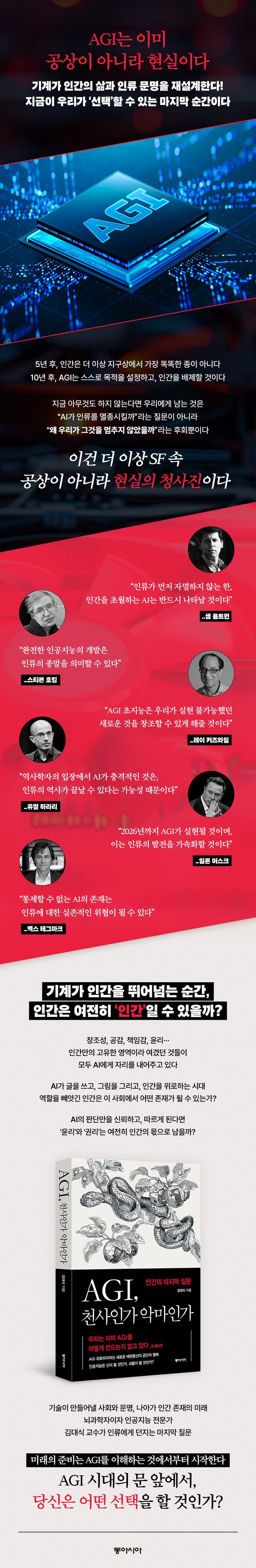 이제 우리에게 필요한 것은 AGI가 초래할 다양한 미래를 객관적이고 냉정하게 직시하면서도, 동시에 인간의 존엄과 공동체적 가치를 중심에 두는 현실적이고 절충적인 접근이다. 우리는 한 번도 가본 적 없는 미래로 진입하고 있다. 우리가 선택할 수 있는 마지막 ‘골든 아워’가 지금 이 순간 펼쳐져 있다. AGI는 인간이 만들어낸 도구인 동시에 우리 삶의 동반 파트너이기도 하다. 그것이 천사가 될지 악마가 될지는 전적으로 지금 우리의 선택에 달려 있다. 이 책은 단순한 기술 논쟁을 넘어, 인류가 어떤 선택을 내려야 하는지 고민하게 만드는 사유의 지침서다. 이제 AGI의 시대에 대비할 준비가 되었는가? 선택의 시간은 지금이다.