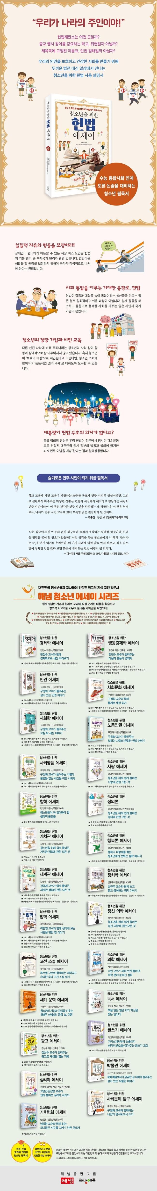 청소년의 창의력과 사고력을 길러주는 국내 대표 청소년 시리즈인 〈해냄 청소년 에세이 시리즈〉의 27번째 책인 이 책은 헌법 교육 전문가인 저자가 청소년의 눈높이에 맞는 해설과 풍부한 판례로 소개하고 있어, 헌법과 친해지고 싶은 청소년이면 누구나 읽을 수 있다. 더불어 교육 현장에서 인간 존엄과 가치를 가르치는 사회과 교사들이 생생한 법교육 안내서로 활용할 수 있으며, 헌법 교육은 물론 민주 시민 교육에도 더할 나위 없는 길잡이가 될 것이다.