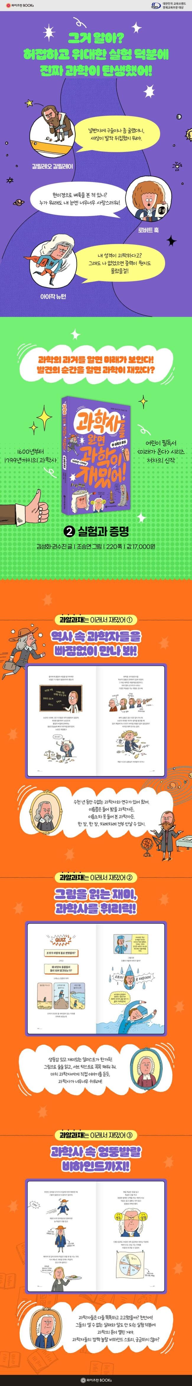‘실험과 증명’은 과학자들이 ‘어떻게 알았을까?’라는 어린이들의 질문에 정면으로 답한다. 머릿속 아이디어가 실제 실험으로, 그리고 증거로 바뀌는 과정을 보면서 과학사 속 인물들이 어떻게 세상의 비밀을 밝혀냈는지를 알 수 있다. 과학이란 책상 위의 이론이 아니라, 세상을 직접 시험해 보고 증명하는 모험이라는 사실을 느끼게 된다.