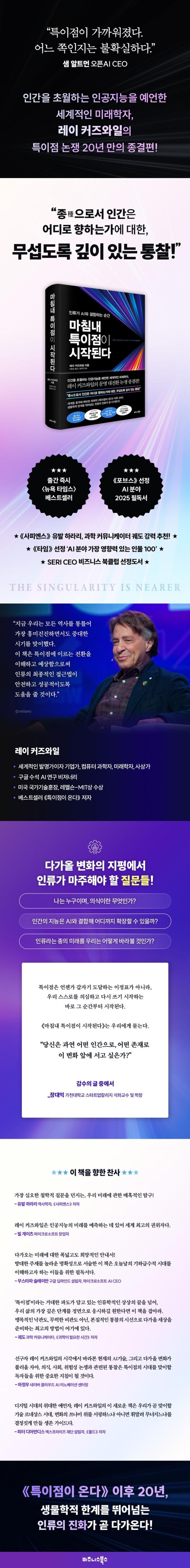 “커즈와일은 숫자와 데이터로 시작해 어느새 존재의 경계와 인간성의 결을 매만지는 철학자가 되었다. 특이점은 언젠가 갑자기 도달하는 이정표가 아니라, 우리가 스스로를 의심하고 다시 쓰기 시작하는 바로 그 순간부터 시작된다. 이 책은 우리에게 묻는다. “당신은 과연 어떤 인간으로, 어떤 존재로 이 변화 앞에 서고 싶은가?”