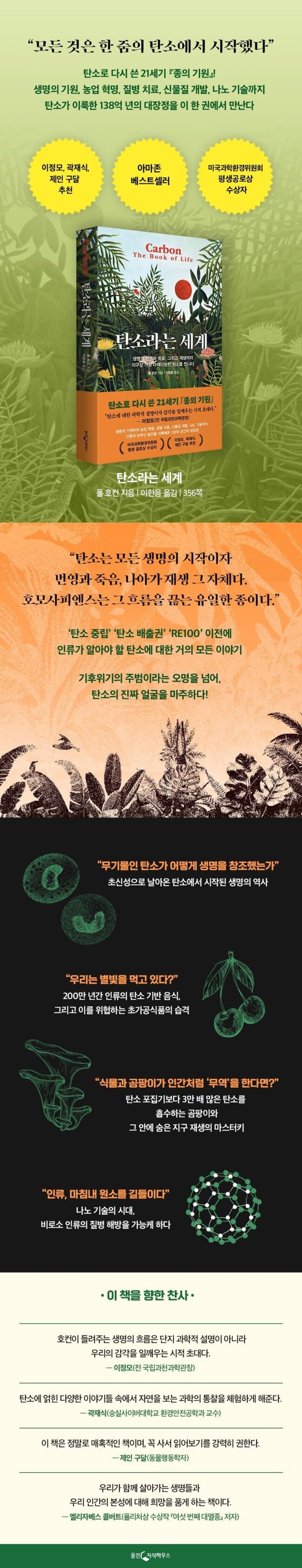 탄소(carbon)는 그동안 기후위기의 주범으로 알려졌다. 정부가 탄소 중립을 핵심 국정 계획으로 내세우고 기업들은 탈탄소화를 신세계로 향하는 비전처럼 여기는 등 현대 사회는 탄소가 해로운 원소라는 오랜 프레임에 갇혀있다. 『탄소라는 세계』의 저자 폴 호컨은 탄소에 대한 이런 오해를 정면으로 반박하며 이렇게 말한다. “탄소는 생명의 모든 자취에 활기를 불어넣는 공학자이자 제작자다.” 지난 60여 년 간 환경운동의 최전선에서 ‘녹색 구루’라 불려온 그는 모든 생명체가 단 한 종도 예외 없이 탄소에서 탄생했다는 사실을 짚어내며, 탄소가 생명력으로 가득한 지구를 만든 과정을 한 편의 서사시처럼 풀어낸다.