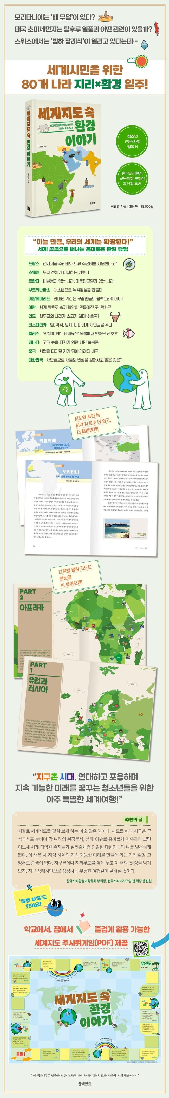《세계지도 속 환경 이야기》는 생태ㆍ환경ㆍ에너지 전문가이자 청소년 베스트셀러 《달력으로 배우는 지구환경 수업》을 쓴 최원형 작가의 신작으로, 80개 나라에서 펼쳐지는 다채로운 환경 이야기를 세계지도와 함께 풀어내고 있는 유일무이한 지리×환경 교양서다. ‘탕후루 열풍과 태국의 초미세먼지 문제는 어떤 관련이 있는지’, ‘온실가스 배출량이 전 세계 1%도 안 되는 파키스탄은 왜 기후 위기 피해를 직격으로 맞았는지’, ‘스위스에서는 왜 빙하 장례식이 열렸는지’ 등 지구 곳곳에서 벌어지고 있는 놀랍고도 재미있는 환경 이야기 속으로 지금 당장 들어가 보자.