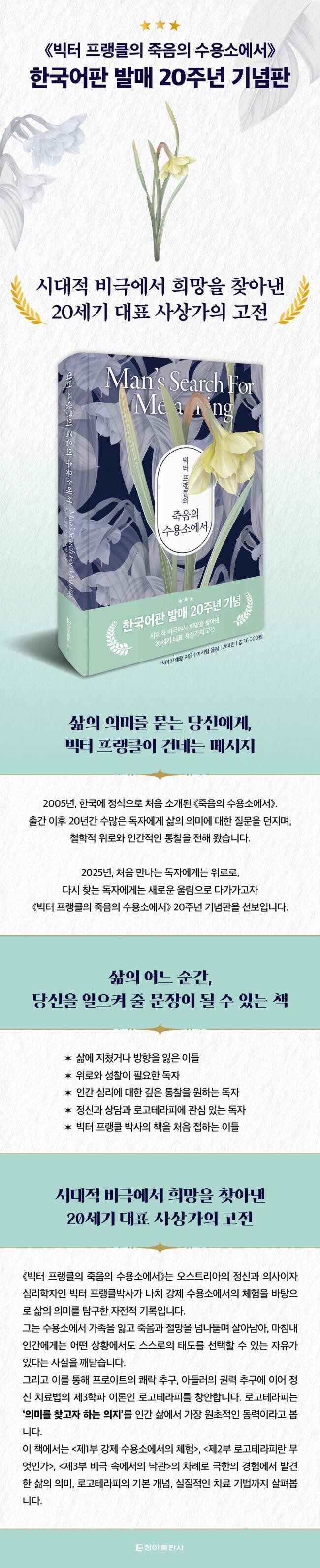 2025년은 빅터 프랭클의 책이 한국에 정식으로 소개된 지 20주년이 되는 해이다. 이를 기념하여 새로운 판형과 디자인으로 20주년 기념 특별판을 출간한다. 프랭클 박사의 깊은 철학적 메시지와 감동적인 이야기의 의미를 독자들과 나누기 위해 준비한 이 기념판은 더 많은 독자에게 삶의 의미를 되새기게 하며, 새로운 독자에게도 감동과 영감을 전할 것이다.