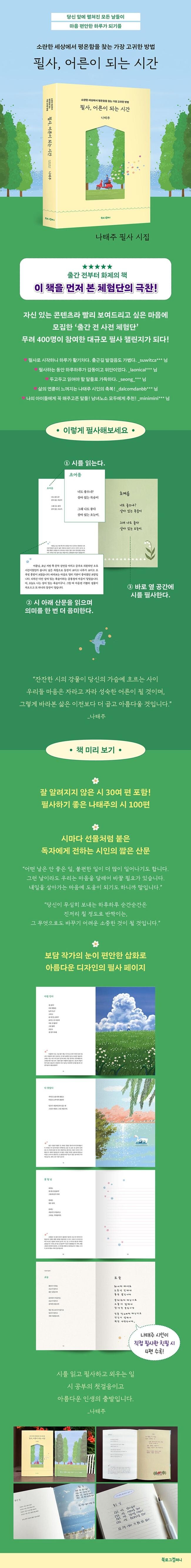 정식 출간 전에 이 책을 사전 체험한 400여 명은 모두 입을 모아 말했다. 나와 다를 것 없는 하루 속에서도 시인은 어쩜 이리 예쁘고 따스한 생각을 할 수 있냐고, 그 생각을 읽고 필사하니 오늘 하루가 달리 보인다고, 그렇게 오늘 하루가 참 좋아진다고, 필사하기 정말 잘했다고.
