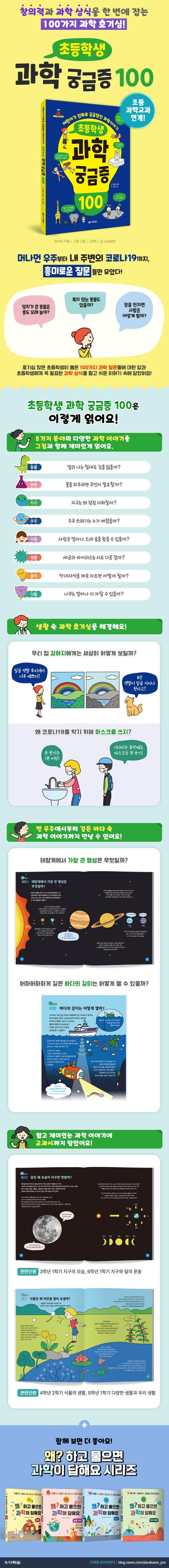 집에서, 학교에서 생활하며 보이는 모든 것에 흥미와 호기심을 가지는 어린이들의 과학 궁금증 100가지를 모았어요. 기발한 질문들을 짧고 쉬운 이야기에 가득 담아냈어요. 사람, 동물, 식물, 우주, 지구 등 8가지 영역으로 나누어서 다양한 주제로 구성했어요. 어렵게만 느껴지는 과학을 그림과 짧은 글로 풀어내 쉽게 접할 수 있어요. 호기심 많은 초등학생들이 뽑은 흥미로운 과학 질문을 한 가지씩 해결하며 읽다 보면 창의력과 과학 지식을 모두 얻을 수 있답니다.