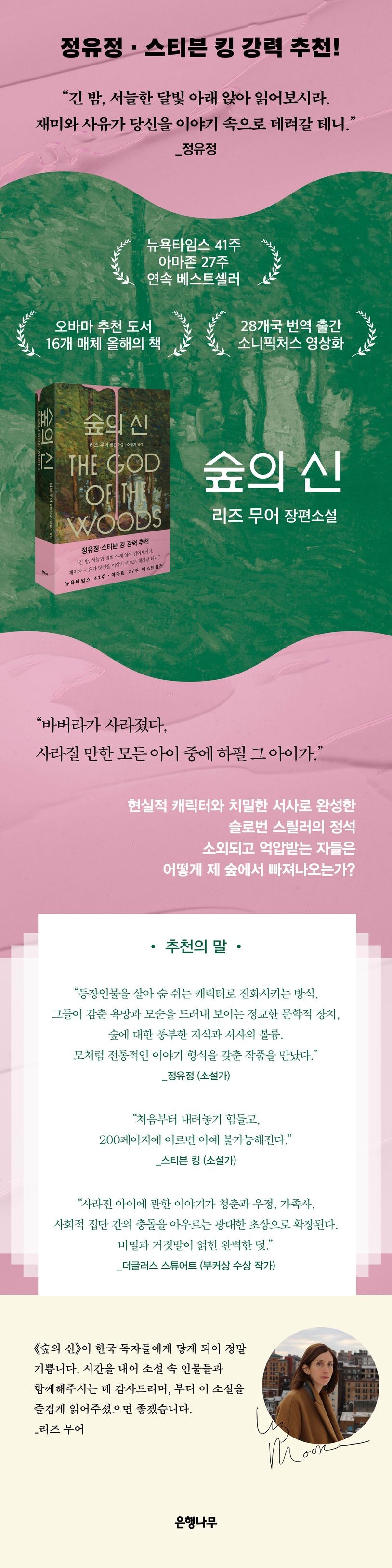 리즈 무어는 대중성과 깊이를 겸비한 작가로, 최근작 《숲의 신》이 밀리언셀러를 기록하고 전 세계 28개국에 출간되면서 세계적인 작가로서의 명성을 공고히 했다. 그의 작품들은 주로 사회적 맥락 속에서 훼손된 인간성에 주목한다. 또한 개인의 경험이나 실제 사건을 바탕으로 온정 어리면서도 명민한 통찰이 담긴 허구를 창조해내는 것이 특징이다. 예컨대 《보이지 않는 세계》에서는 물리학자의 자녀로서의 경험을 인간성의 경계에 대한 질문으로 확장했으며, 《길고 빛나는 강》은 미국이 직면한 오피오이드 마약 위기를 긴장감 넘치는 범죄소설로 풀어냈다. 《숲의 신》 역시 실제 미제 실종 사건과 악명 높은 연쇄 살인범을 모티프로, 흥미진진한 스릴러 문법 안에서 일그러진 사회의 서늘한 민낯을 고발한다.