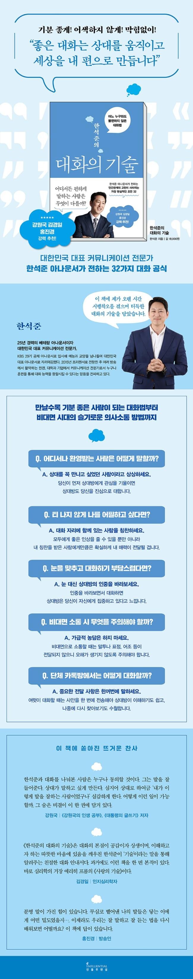 “대화는 배우면 누구나 잘할 수 있습니다.” 한석준의 이 말처럼, 이 책은 독자들에게 구체적이고 실천 가능한 대화법을 제시한다. 그가 전하는 대화의 기술을 하나씩 따라 하다 보면, 어느새 당신은 주변 사람들이 대화하고 싶어 하는 매력적인 사람으로 거듭나 있을 것이다.