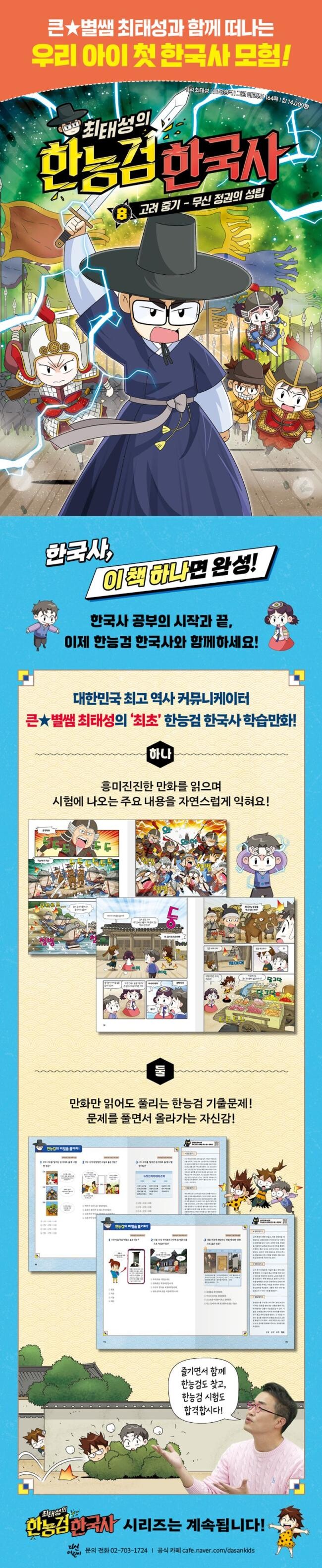 이 책의 본문 중간에는 한능검 기출문제가 충실하게 실려 있습니다. 어린이들은 문제를 풀며, 만화의 내용만 잘 따라가도 충분히 문제를 해결할 수 있다는 자신감을 얻게 될 것입니다. 또 700만 수강생의 선택을 받았던 큰별쌤의 꼼꼼한 해설도 달려 있습니다. 또 책을 읽은 뒤에는 QR코드를 통해 온라인으로 제공하는 ‘마스터팩’을 이용하여 만화와는 다른 방식으로 후삼국 시대와 고려 초기의 성장 과정을 학습해 볼 수 있습니다. 이를 통해 어린이들은 어렵게 암기하지 않고도 효과적으로 한국사 지식을 습득하게 될 것입니다.