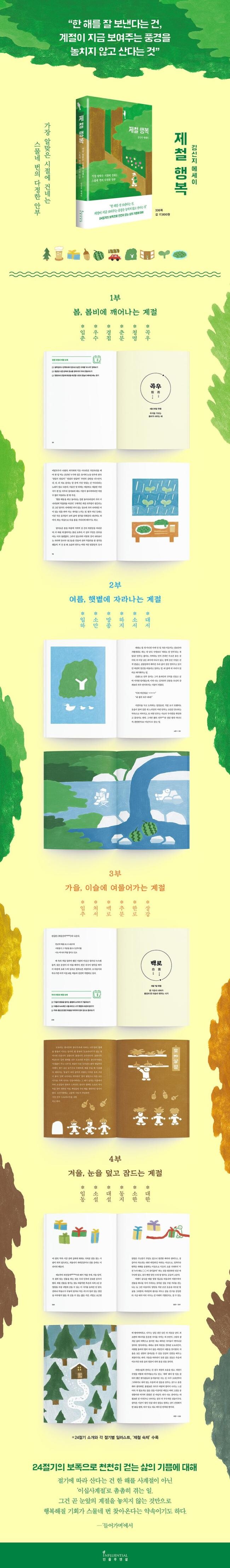 지금을 놓치면 1년을 기다려야 하는 행복이 있다. 청명 즈음 꽃비 맞으며 하는 산책, 여름밤의 낭만이 가득한 망종 무렵의 축제, 하지 감자로 만드는 회심의 요리, 밤이 긴 날 우리만의 아지트에 둘러앉아 도란도란 나누는 대화…… 그러고 보면 스물네 번 찾아오는 절기 중 허투루 보낼 만한 시기란 없다.