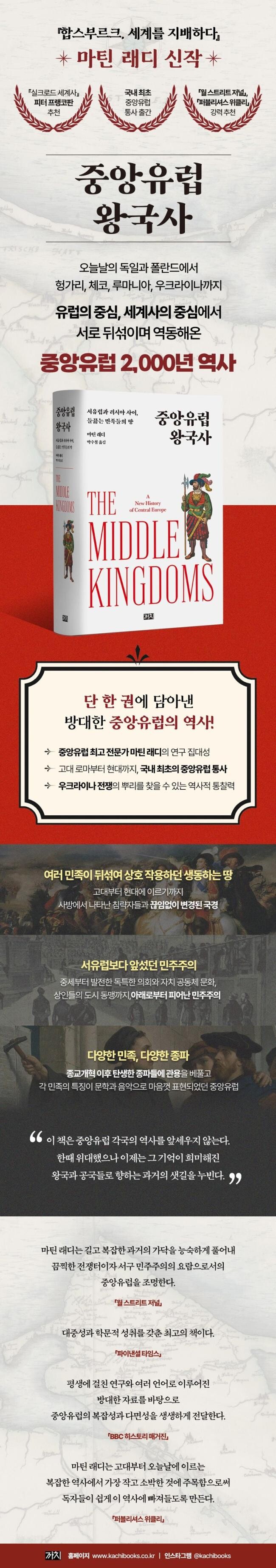 『중앙유럽 왕국사』는 국내에서는 처음으로 중앙유럽의 역사를 포괄적으로 소개한다. 중앙유럽의 역사를 본격적으로 다룬 책이 여태껏 없었던 이유는 이곳의 정치적 경계선이 끊임없이 변경되어왔을 뿐만 아니라, 그곳에 살고 있는 민족 또한 다양해서 다루기가 까다로운 탓이기도 했다. 중앙유럽 역사에서 명실상부 최고의 전문가로 인정받는 마틴 래디는 중앙유럽을 단순한 지리적 개념이 아니라 여러 민족들이 상호 작용한 공간으로 정의하며, 그 역사를 오늘날의 폴란드와 헝가리, 체코, 독일인의 땅, 우크라이나, 스위스, 발트 3국까지 확대한다. 이러한 관점은 끊임없이 나타났다 사라지는 왕국들 사이에서 길을 잃기 십상인 중앙유럽 역사 서술의 어려움을 뛰어넘어 이 지역의 전체적인 역사를 이해하게 해준다는 점에서 유용하다. 또한 적재적소에 삽입된 지도들은 중앙유럽의 바뀌어가는 상황을 한눈에 파악할 수 있도록 돕는다.