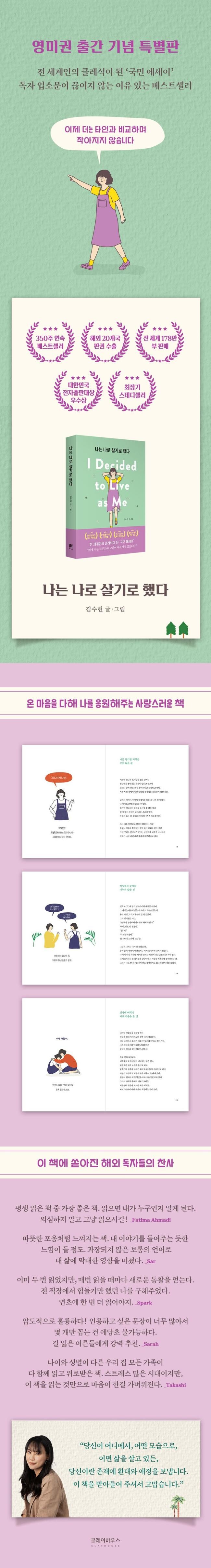 “공감 100%! 마치 나를 위해 쓴 책 같다.” “작가의 시원하고 깔끔한 문장을 읽는데, 그게 또 너무 섬세해서 위로가 된다.” “정말 속이 뻥 뚫린다는 게 이런 것일까?” “읽다 보면 마음이 건강해지는 느낌이 든다.” 이런 독자 리뷰가 넘쳐나는 데는 다 이유가 있는 것이다. 무엇보다 “온 마음을 다해 나를 응원해주는 느낌”이라는 평이 많은데, 이건 실제로 작가가 이 책을 자신과 비슷한 감정을 느끼며 힘들어하고 있을 독자를 위해 진심을 담아 썼기 때문이다. 그 마음은 이번 개정증보판 작업을 할 때도 조금도 달라지지 않았다. 이제 더 단단해지고 속 깊어진 『나는 나로 살기로 했다』가 당신의 곁에서 당신의 삶을 응원할 것이다.